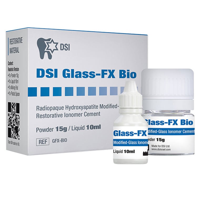 DSI Glass-FX Bio Hydroxyapatite Modified-Glass Ionomer Cement, 15g Powder & 10 mL Liquid. Adhesive cement specifically formulated to adhere strongly to tooth substances and non-precious alloys without requiring etching or priming. Radiopaque. High fluoride release. Low solubility. Very low film thickness. Setting time: 1:30-2:00 minutes. Compressive strength >140 MPa.