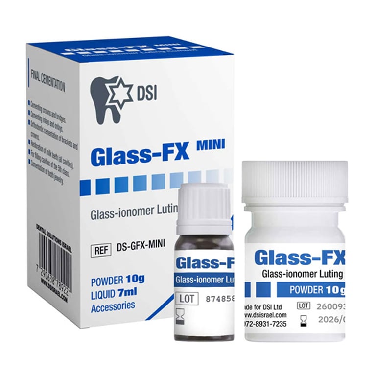 Glass-FX Mini Glass-ionomer Luting Cement Kit - 10g Powder, 7 mL Liquid & Mixing Accessories. Lifelong cementations designed to form a chemical bond with enamel, dentin, and metal. Has been finely ground and screened down to an average particle size of less than 6 microns (<6m). Extraordinary compressive strength. Fluoride discharge. Radiopaque. Prevent the accumulation of plaque. Easy mix, less chair-time. Negligible pupal response. Working time: 2' 30". Setting time: 6.5 minutes maximum.